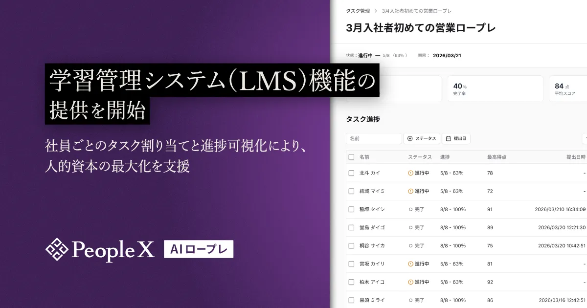 株式会社PeopleX(本社:東京都新宿区、代表取締役CEO:橘 大地)は、対話型AIロープレサービス「PeopleX AIロープレ」に学習管理システム(LMS)機能を新たに追加したことを発表しました。この機能により、各社員に対するタスクを効果的に割り当て、その進捗状況を一元管理できるようになり、社員一人ひとりの能力向上を強力に支援します。