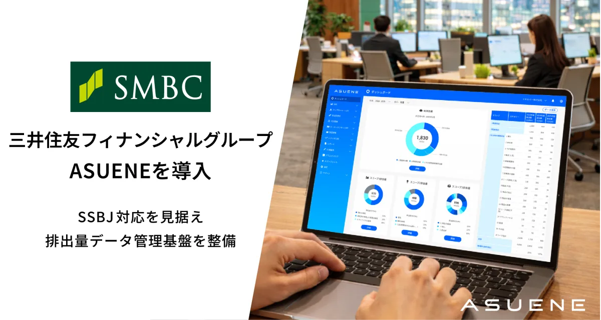 アスエネ株式会社が提供するCO2排出量の見える化および管理クラウドサービス『ASUENE』が、株式会社三井住友フィナンシャルグループ(以下、SMBCグループ)に導入されました。これは、グループ全体のサステナビリティ推進を強化する一環として位置づけられています。SMBCグループは、国内外に約3000の拠点を持ち、そのCO2排出量データの一元管理を目指しています。