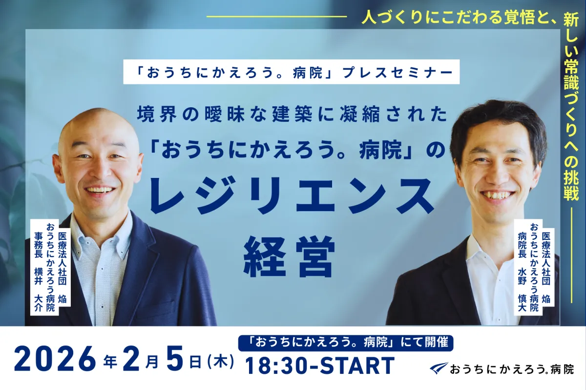 医療法人社団焔が運営する「おうちにかえろう。病院」では、2026年2月5日(木)にプレスセミナーを行います。テーマは「境界の曖昧な建築に凝縮された、『おうちにかえろう。病院』のレジリエンス経営」です。このセミナーは、持続可能な病院経営を目指し、「人づくり」を中心にした取り組みや建築デザインを紹介するものです。