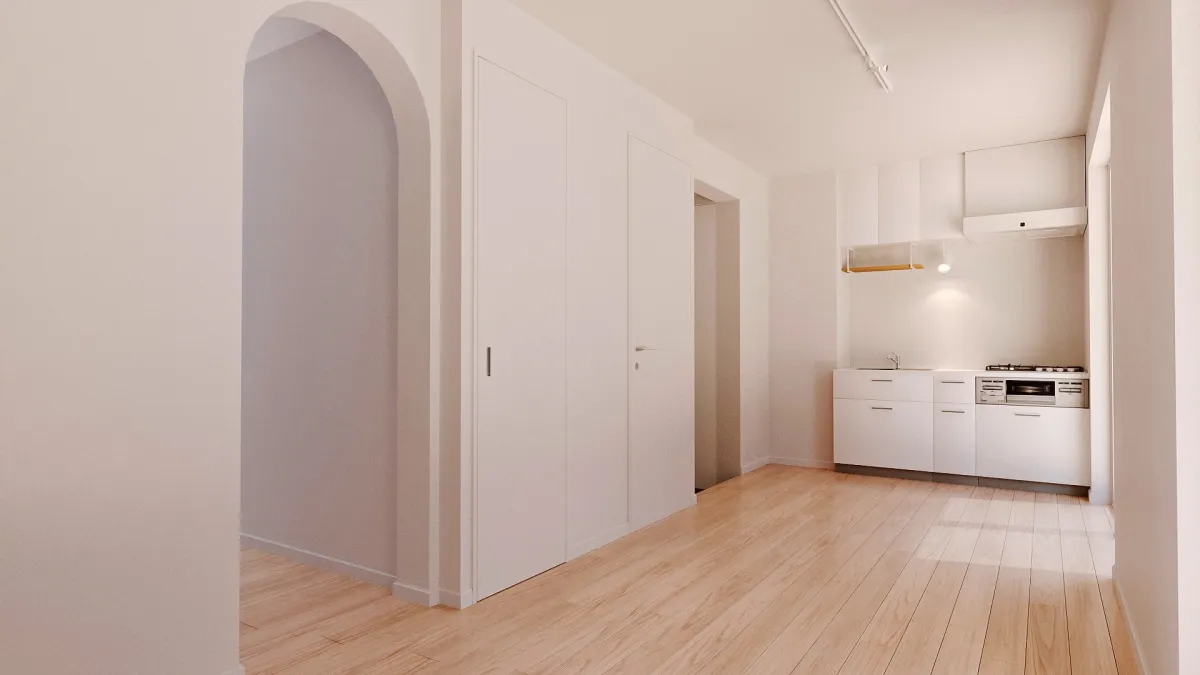 各住戸は、約10帖のLDKと独立した約4帖の寝室を持ち、二人暮らしでも快適に過ごせる設計が施されています。天然無垢のフローリングが使用され、全体的に明るくシンプルな内装が特徴です。空間を柔らかくつなぐアーチ開口が非常に印象的で、住環境に居心地の良さを演出しています。また、人工大理石天板のシステムキッチンは広々とした作業スペースが確保されており、料理好きにはたまらない設備です。さらに、プライベート空間であるバス・トイレ・洗面台がそれぞれ独立しているため、お金な生活動線を保ちながらリラックスできる住空間になっています。