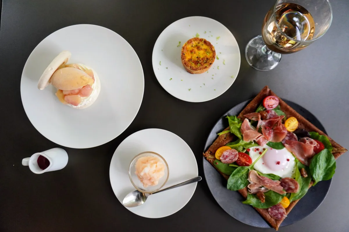 モーニングメニューの一部には、バジルとルビーグレープフルーツのシャーベットが登場。その後は、香ばしく焼き上げたタルトオニオン、米粉で作ったガレットが特徴です。このガレットは、ロゼワインまたはティーソーダとのセットで提供され、朝から爽やかなスタートを切ることができます。最後に、コーヒーまたは紅茶付きのペッシュメルバというスイーツが用意されることで、夏らしいさっぱりとした締めくくりになっています。