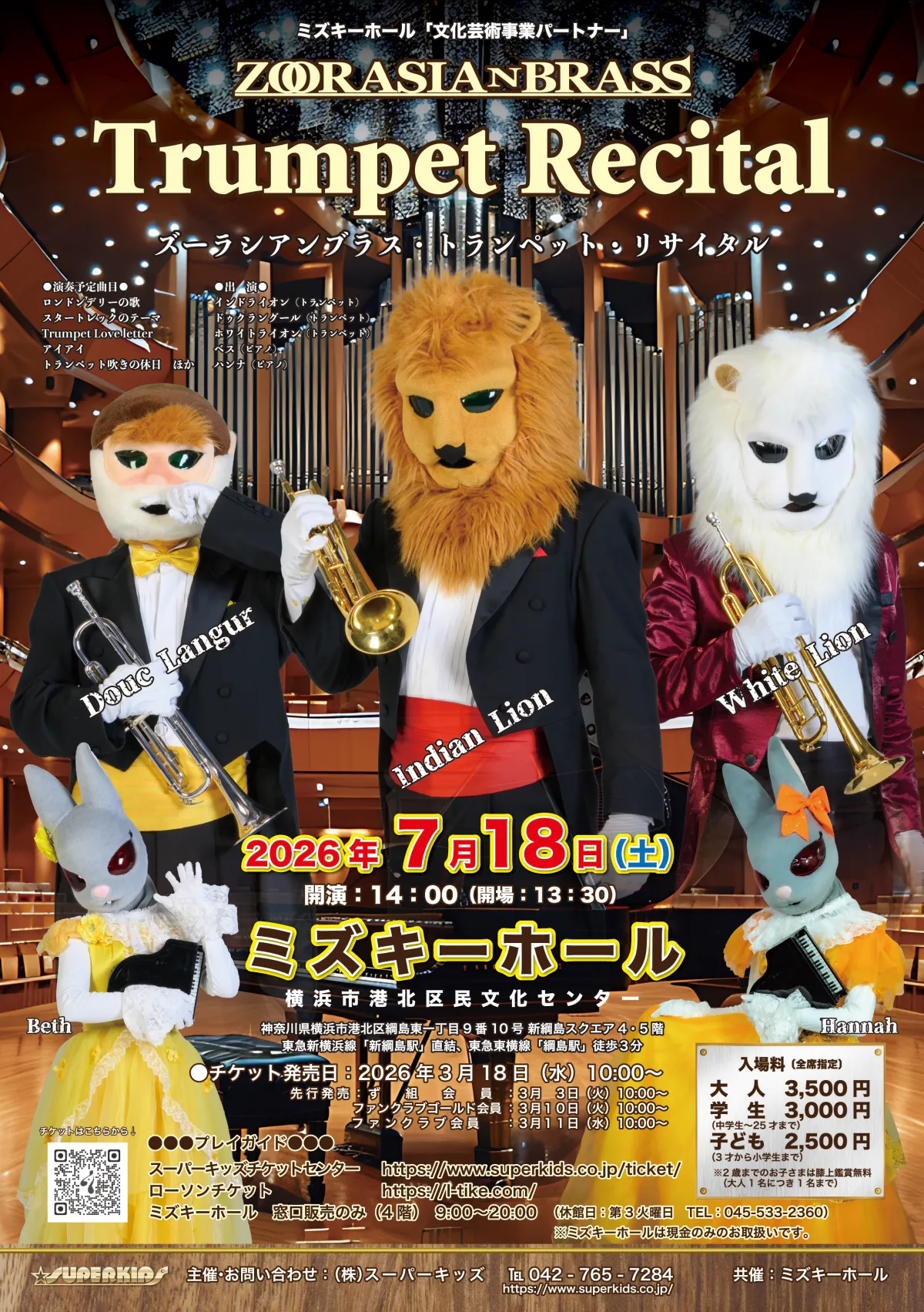 2026年7月18日(土)、神奈川県横浜市にあるミズキーホールにて、「ズーラシアンブラス・トランペット・リサイタル」が開催されます。今回は、ズーラシアンブラスのトランペッター3名、すなわちインドライオン、ドゥクラングール、ホワイトライオンの個性的な演奏をお楽しみいただけます。このコンサートは、トランペットのソロ曲を中心に構成され、彼らの卓越した技術や魅力を存分に披露する機会となっています。