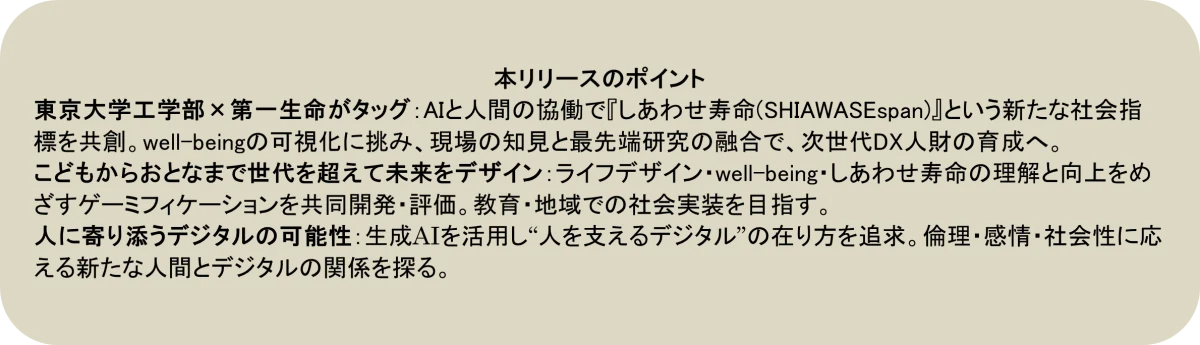 本研究では、生成AIなど先端テクノロジーの活用により、現状の AIが人間の倫理性や社会性、そして「しあわせ」という主観的な価値観をどの程度理解し、それに基づく意思決定や学習支援にどのように寄与できるかを多角的に検証します。また、第一生命保険株式会社や第一生命経済研究所を挙げたプロジェクトグループ横断の取り組みとして、特にAIやデジタル技術の知識を活かす研究メンバーを社内公募し、選ばれた社員は研究に参加しつつ、東京大学から新しい知識と経験を得ることが期待されています。