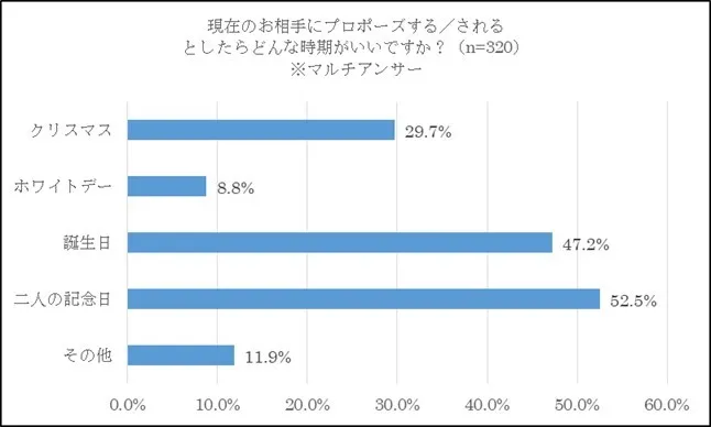 調査では、今の交際相手にどのタイミングでプロポーズするかという質問の回答が集まりました。この結果、最も多くの人が選んだのは、2人の記念日で52.5%、続いて誕生日が47.2%、クリスマスが29.7%となりました。この傾向は、多くのカップルが特別な日を基にしてプロポーズを計画していることを示しています。