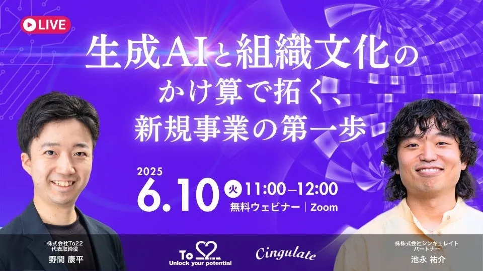 株式会社シンギュレイトが、株式会社To22との共催で「生成AIと組織文化のかけ算で拓く、新規事業の第一歩」を2025年6月10日(火)に開催します。このセミナーは、新規事業開発において直面するさまざまな課題へ対処する具体的な方法を提供するものです。