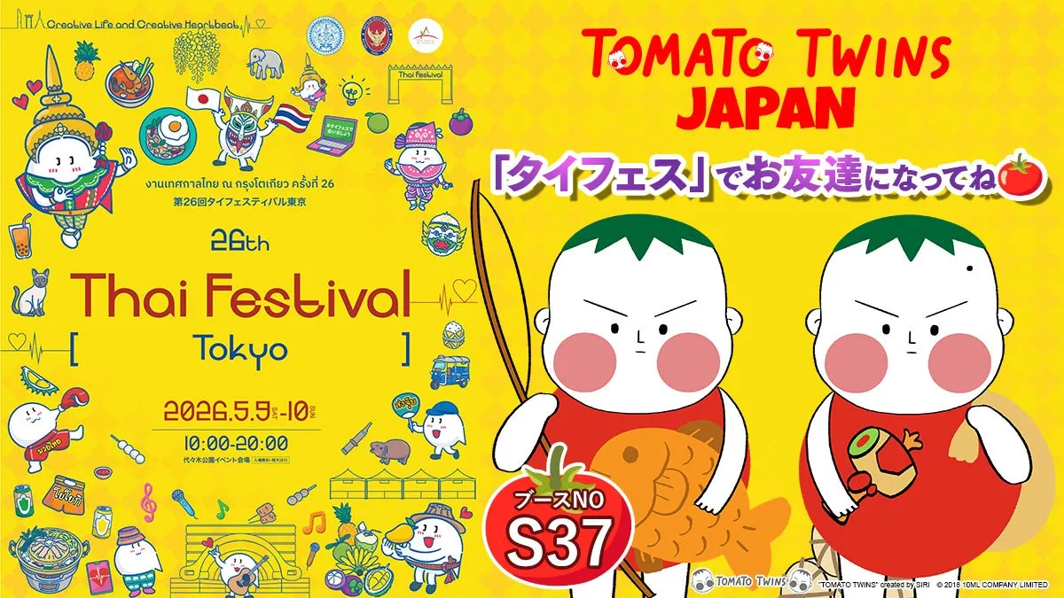 「第26回 タイフェスティバル東京」は、2026年5月9日(土)と10日(日)に東京都渋谷区の代々木公園にて行われます。ブース名は『TOMATO TWINS JAPAN』で、来場者にはノベルティの配布やキャラクターの紹介を行う予定です。