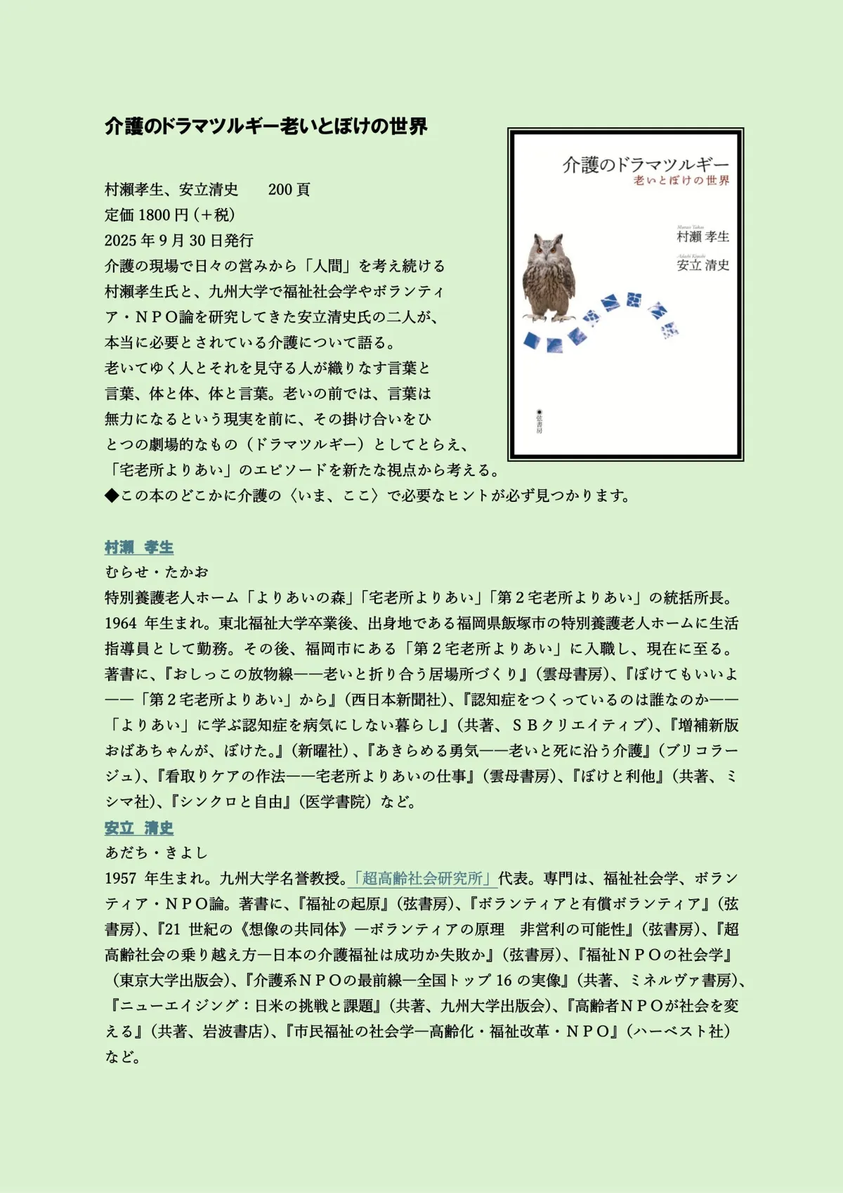 安立先生は、近著『介護のドラマツルギー――老いとぼけの世界』(弦書房)をテーマに、地域での支援や介護の質を高めるための視点を提供します。講演では、特に宅老所の日常を通じて、介護を受ける側と見守る側の関係性に焦点を当て、「介護のドラマツルギー」という新しい視点からその重要性を説きます。