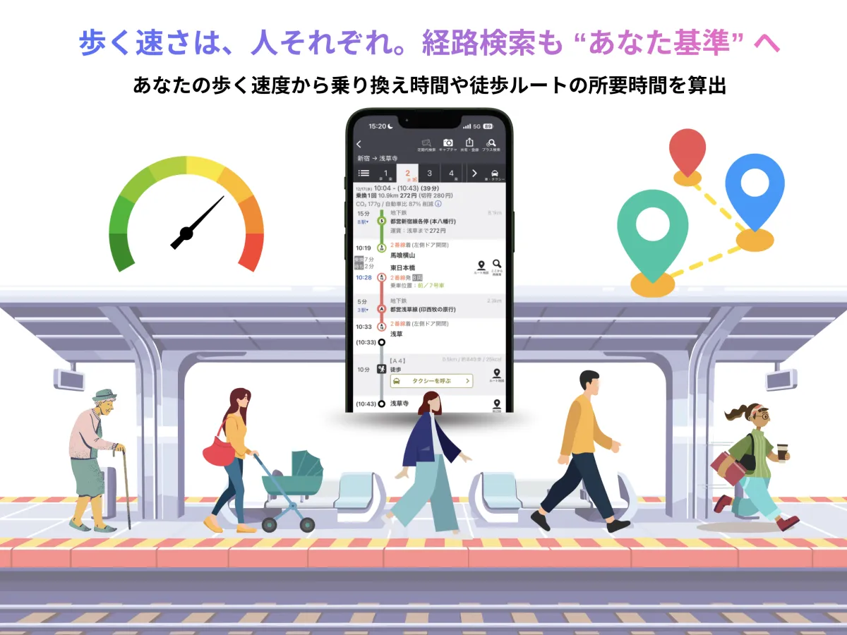 これまでの経路検索は、標準的な歩行速度に基づいて計算されていました。そのため、多くのユーザーが実際の移動時間と経路案内の間にギャップを感じることがありました。「乗り継ぎ時間が足りなかった」「案内に比べて遅れた」といった意見があったのもその一因です。そこで、ジョルダンでは、ユーザーごとの歩行速度を自動計測し、真に無理のない経路案内を実現するための機能開発を行いました。