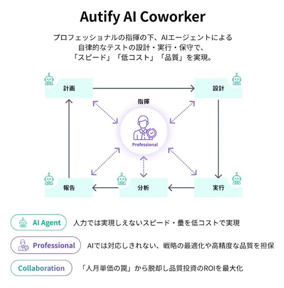 現場では、エンジニアリソースの枯渇やリードタイムの長期化が深刻な問題になっています。メンバーの能力によって成果が左右されることや、納期遅れと品質低下のトレードオフの問題も抱えていますが、Autify AI Coworkerはこれを解消すべく設計されました。AIエージェントとプロフェッショナルのそれぞれの強みを最大限に活かすことで、スケーラブルなQA体制への移行を支援します。これは特に、労働人口の減少と人件費の高騰が予想される中で、多くの企業が抱える問題に対する有力な解決策となるでしょう。
