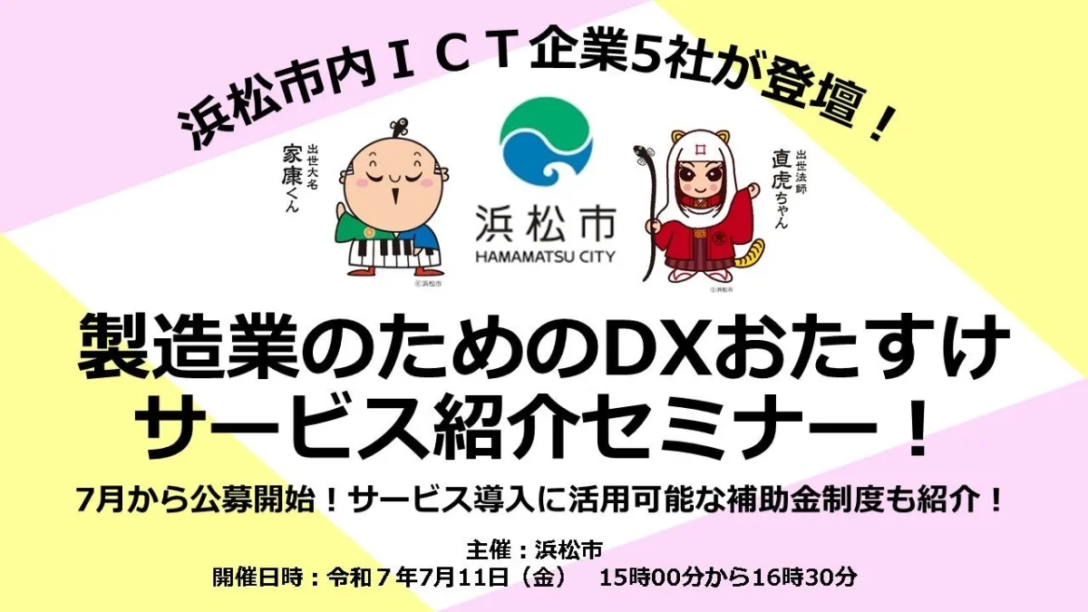 2023年7月11日(金)、浜松市にて「製造業のためのDXおたすけサービス紹介セミナー」が開催されます。本セミナーでは、地域製造業の競争力向上や生産性向上、労働力不足への対策を目的に、浜松市内のICT企業5社が集結し、各社のDX支援サービスを紹介します。