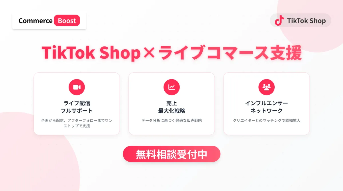 株式会社コマースブーストは、代表取締役の宮原和也氏のリーダーシップのもと、東京都渋谷区桜ヶ丘に本社を構え、ライブコマースの企画・制作、TikTok活用支援、D2Cブランドのプロデュースを行っています。詳細情報は公式サイトで確認できます。