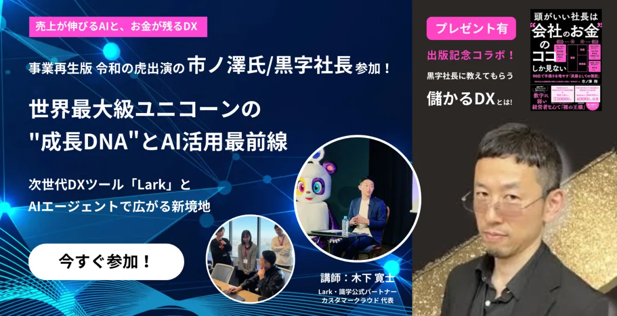 カスタマークラウド株式会社が主催する特別セミナー「中小企業が儲かるDX」が、2月14日に開催されます。講師は、事業再生版『令和の虎』でお馴染みの黒字社長・市ノ澤翔氏。最新のDX戦略と生成AI活用法を学べる貴重な機会です。本セミナーでは、特に中小企業がどのようにデジタル変革を進め、実際に利益を上げることができるのかに焦点を当てます。