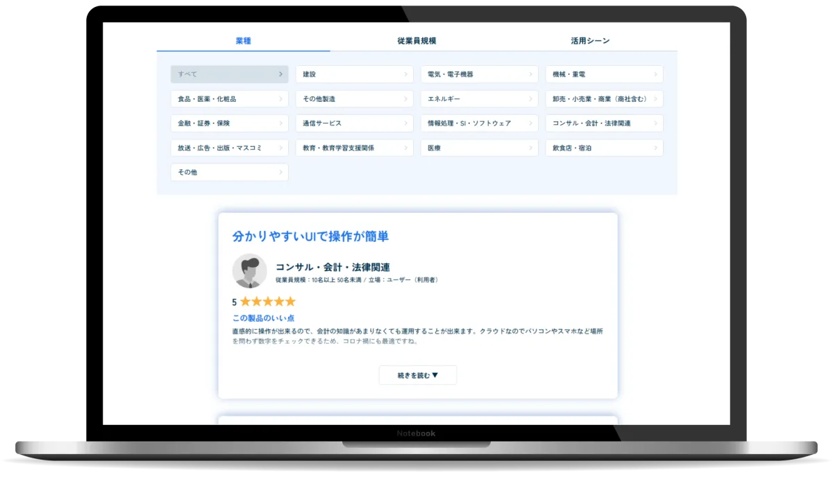 ユーザーは業種、従業員規模、活用シーンの3つの条件からレビューを検索できる仕組みになっています。同じような課題を抱える企業のレビューを容易に見つけることができ、具体的な参考情報を得ることが可能です。