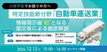 2024年12月12日、株式会社エネクト(本社:東京都千代田区、代表:山田卓)は、運送業界の人事や採用担当者、メディア関係者を対象に「特定技能自動車運送業分野における特定技能外国人の受入れ」に関するウェビナーを実施しました。これは新制度の概要を理解し、運送業界における外国人材の受け入れ施策について情報を共有するための機会です。