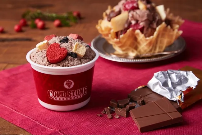 『チョコレート ラバーズ』は、コールドストーン店舗で人気のチョコレートアイスクリームとラズベリー、クランベリーのジェラートを再現しています。商品は1つ1つ手作りされており、アイスクリームとトッピングが混ざったときの特有のボリューム感を巧みに再現しています。また、商品名にもインスパイアされた“ハートマーク”のデザインが施されており、見た目にも心が温まります。