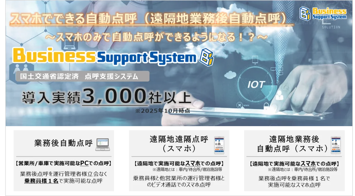 運送業務における効率化は、常に求められています。株式会社デンソーソリューションが提供するビジネスサポートシステム(BSS)は、3,000社以上の運送事業者に導入されています。このシステムは、運輸規則に基づいたスマホでの自動点呼機能を新たに搭載し、運行管理が大きく変革しようとしています。