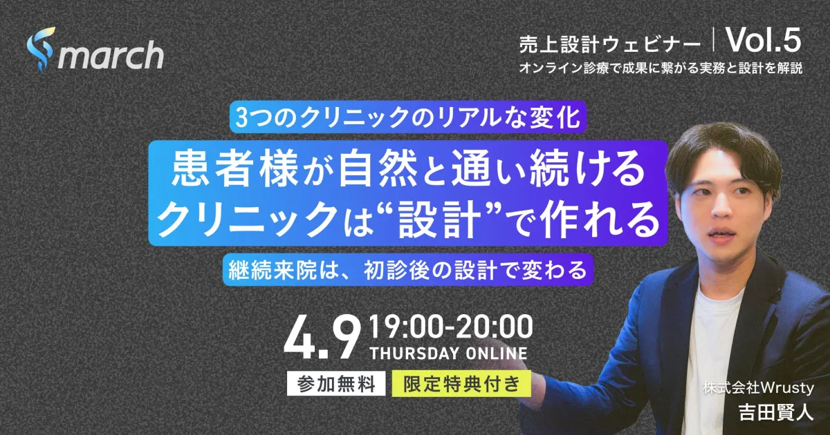 2026年4月9日(木)19:00から、株式会社Wrustyが主催する無料オンラインセミナー「3つのクリニックのリアルな変化」が開催されます。このセミナーは、全国の医療機関の理事長や院長、事務長、運営担当者などを対象に、オンライン診療をより効果的に活用するための重要なヒントを提供します。
