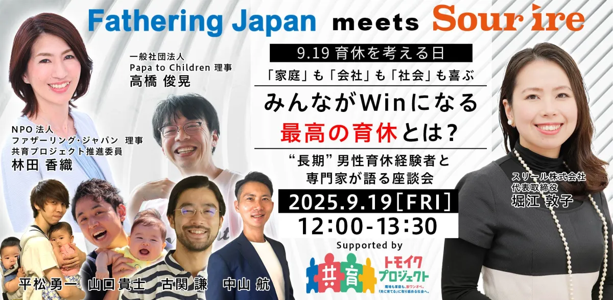本イベントは、育休を取得した父親たちやそのパートナー、職場の同僚、人事担当者など多様な立場の参加者が集まり、それぞれの経験と課題をシェアします。第一部では、実際に育休を取得した男性たちが「どうすれば最高の育休となったか」を語り合い、その中で企業が直面する問題やそれを解決するための方法を専門家から学ぶことができます。特に、スリール株式会社の代表である堀江敦子氏が、企業における男性育休の価値とその導入方法について語ります。