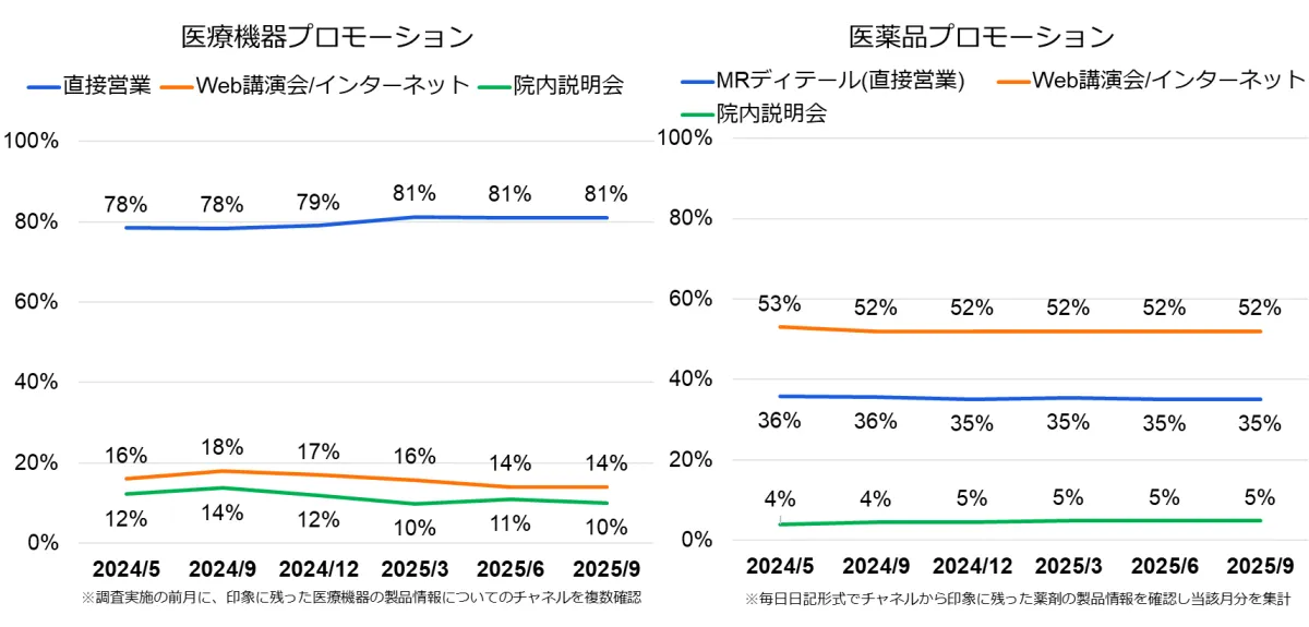 プロモーション活動の一環として、製薬企業のプロモーション活動を記録している調査Impact Trackのデータとも一致しており、医療機器の製品情報入手状況には大きな変化は見えませんでした。