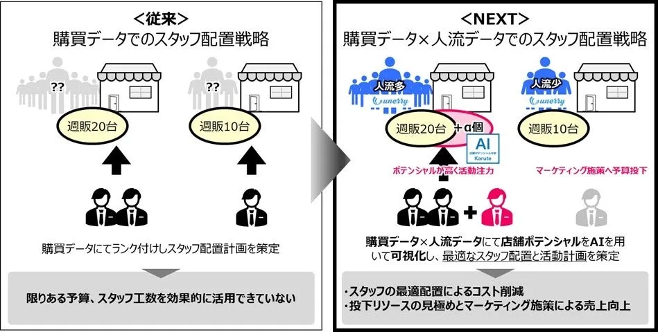 この新サービスでは、メーカーの持つ購買データとunerryが提供する店舗単位の人流データを巧みに組み合わせます。AI技術を用いて来店・購買傾向を可視化し、店舗ごとのカルテを作成することで、スタッフ配置やマーケティング施策を最適化します。このように、データに基づいた店舗への訪問選定を行うことができ、結果としてメーカーの売上最大化を支援します。また、F2F営業職のスタッフを効率的に配置することで、コスト低減と業務の迅速化を図ります。