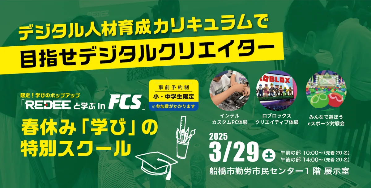 2025年3月29日、船橋市にある勤労市民センターで『春休み「学び」の特別スクール』が行われました。このイベントは、REDEE株式会社が主催し、公益財団法人船橋市中小企業勤労者福祉サービスセンター(FCS)と提携して、デジタル人材育成を目的としたプログラムを提供しました。