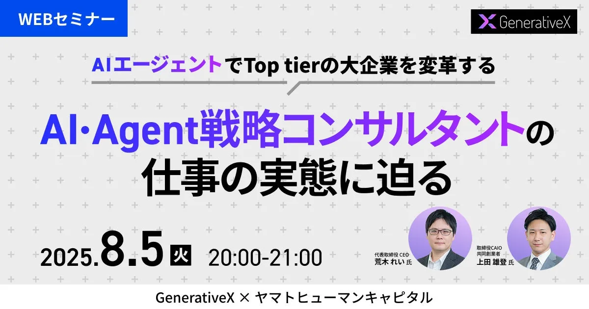 2025年8月5日、ヤマトヒューマンキャピタル株式会社主催のウェビナーが開催されます。このオンラインイベントでは、株式会社GenerativeXの代表取締役CEO 荒木れい氏と、取締役CAIO・共同創業者の上田雄登氏が登壇し、AIエージェントの実際の活用法とその影響について語ります。