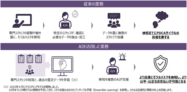 さらに、専門スタッフの知見を元にした過去データの学習をAIが行うことで、これまでの経験やノウハウを体系化し、高度な検知能力を実現します。これにより、従来の業務で抱えていた時間やマンパワーの課題の解消が期待されています。