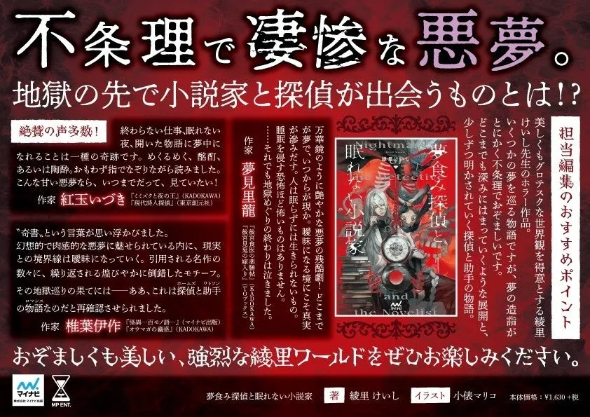 2026年2月18日、株式会社マイナビ出版から新刊『夢食み探偵と眠れない小説家』が登場します。本書は、人気シリーズ『異世界拷問姫』を手がける綾里けいし氏が描く、独特のホラー作品です。物語は、極度の不眠に悩む専業小説家と、夢の専門家である探偵との出会いから始まります。