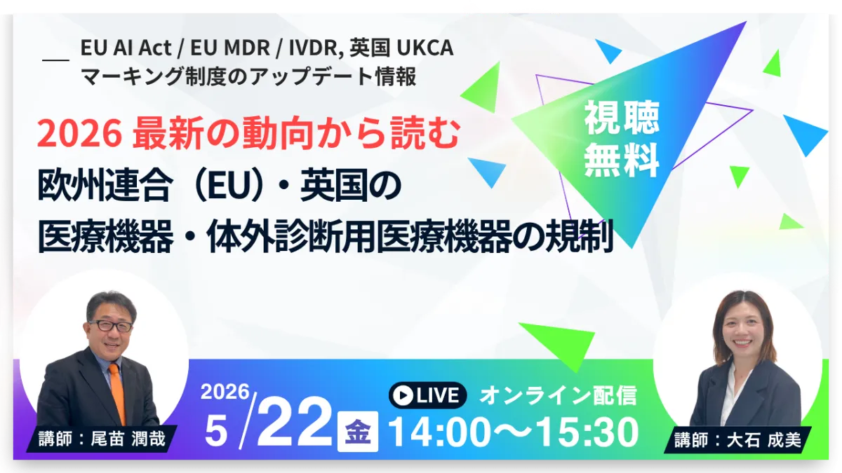 2026年5月22日(金)に、株式会社Berryが主催する無料オンラインセミナーが開催されます。このセミナーは、EUおよび英国の医療機器規制の最新動向を掘り下げるもので、特に「EU AI Act」「EU MDR」「IVDR」、そして「英国UKCAマーキング」の制度についての情報が得られます。EU最大のノーティファイドボディであるBSIグループジャパンの専門家、尾苗潤哉氏と大石成美氏が講師を務め、規制の転換期における戦略的対応のポイントを詳しく解説します。
