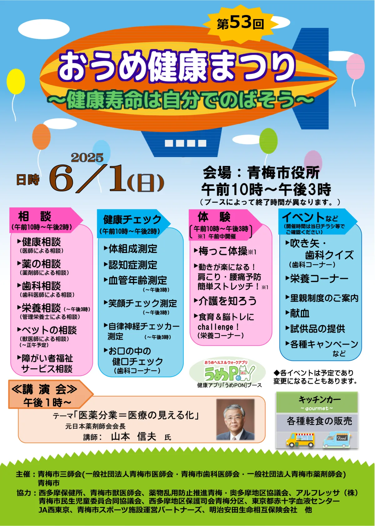 午後の時間帯には、青梅市役所2階の会議室で特別講演会が開催されます。この講演会のテーマは『医薬分業=医療の見える化』で、講師は元日本薬剤師会会長の山本信夫氏です。医療や薬の役割について、私たちの日常にどう影響を与えるのか、理解を深める良い機会です。