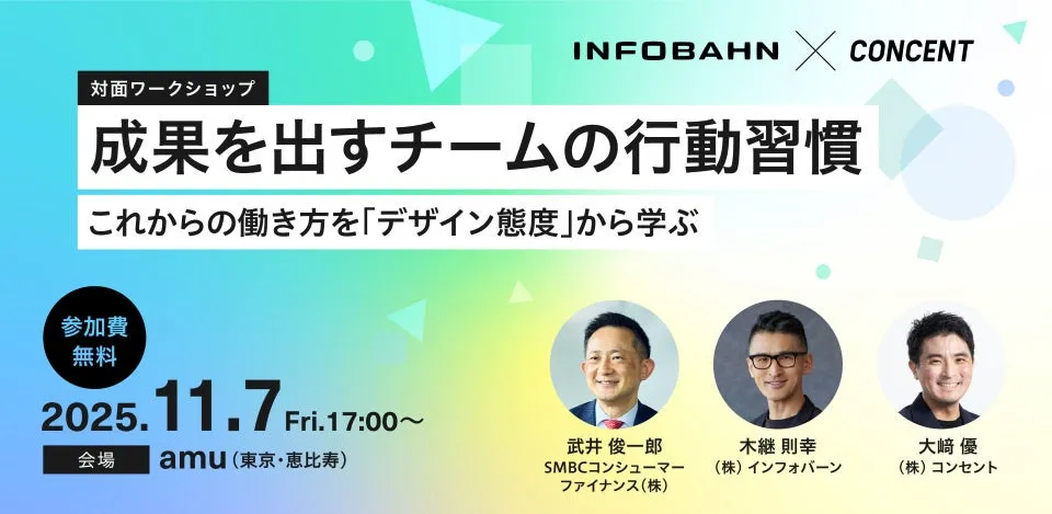 2025年11月7日に、東京・恵比寿にて株式会社コンセントと株式会社インフォバーンが主催するセミナー「成果を出すチームの行動習慣〜これからの働き方を『デザイン態度』から学ぶ」が開催されます。このセミナーの目玉は、SMBCコンシューマーファイナンス株式会社のIT戦略部長、武井俊一郎氏の講演です。