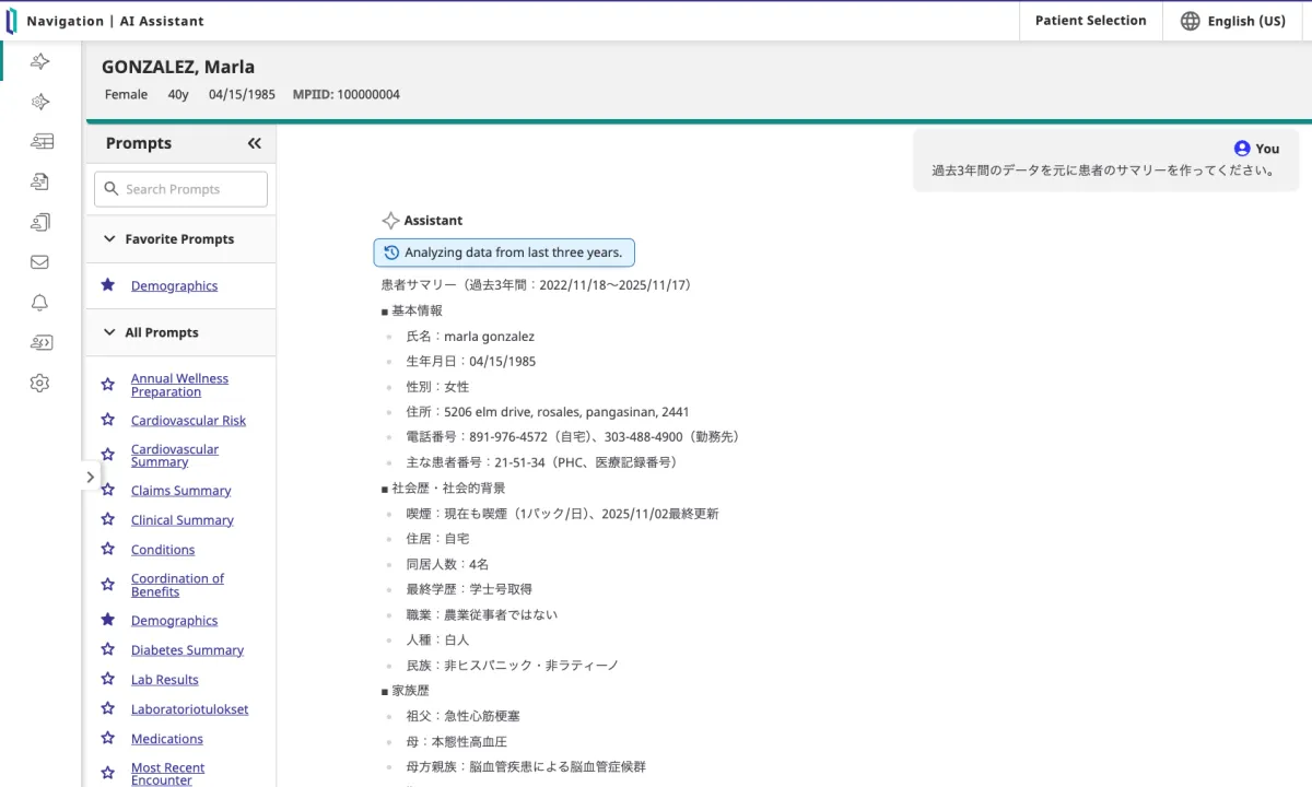 - - 対話型チャットインターフェース: 平易な表現で臨床的な質問や患者のサマリーをリクエストし、迅速かつ内容に則した回答が得られます。