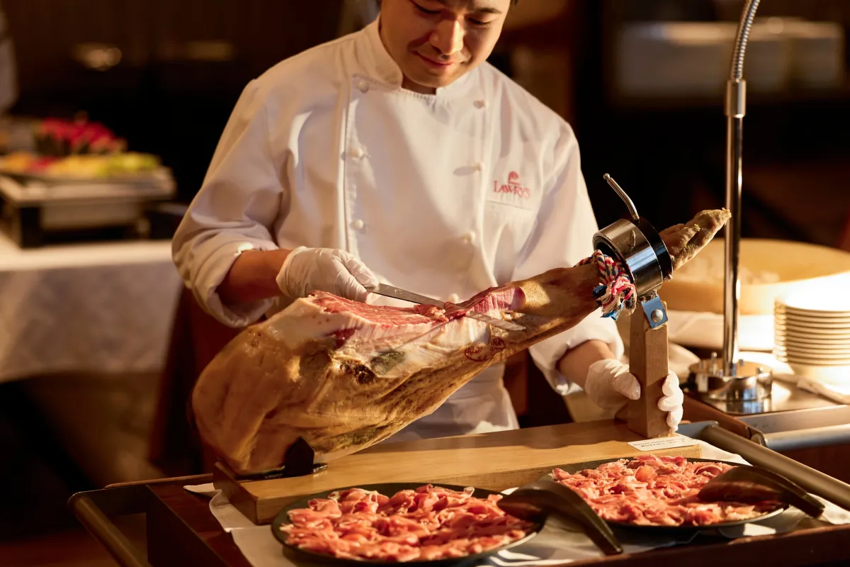 新春にふさわしい華やかな料理が、豪華な前菜から始まり、彩り豊かなホットフード、そして新鮮な素材を使ったサラダバーまで、多種多様なメニューをご用意しました。特にパティシエが手掛けた迎春スイーツやフルーツは、季節感を楽しめる華やかな味わいが自慢です。また、ライブキッチンでは、シェフが目の前で料理を仕上げる様子を見ることができ、その香りや音が一層贅沢な食事の時間を演出します。