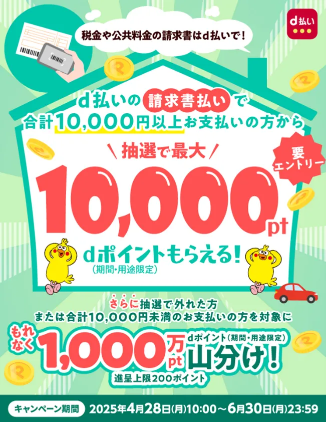 2025年も注目のキャンペーンが登場します。株式会社NTTドコモが提供する「d払い」の請求書払いを利用して、抽選または山分けでdポイントがもらえるチャンスです。本キャンペーンは、2025年4月28日(月)から2025年6月30日(月)までの期間限定となっています。