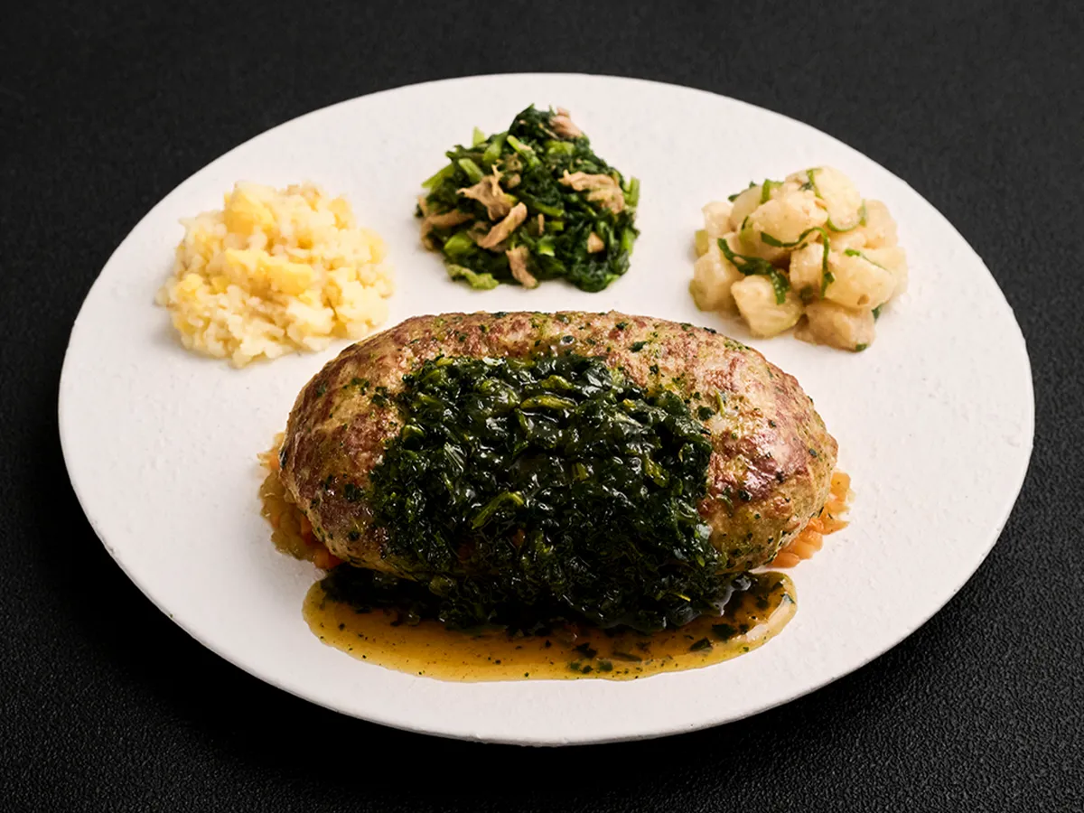このハンバーグの特徴は、牡蠣の旨みを凝縮したオイスターソースを使った特製和風ソースです。牛肉が多めの粗挽き肉で作られたジューシーなハンバーグは、ほうれん草をたっぷり使ったソースと合わせることで、脂っこさを感じさせずに肉の旨みを引き立てています。ソースに広がるほうれん草の香りが食欲をそそり、ボリューム感も満点ながら最後まで飽きずに楽しむことができます。