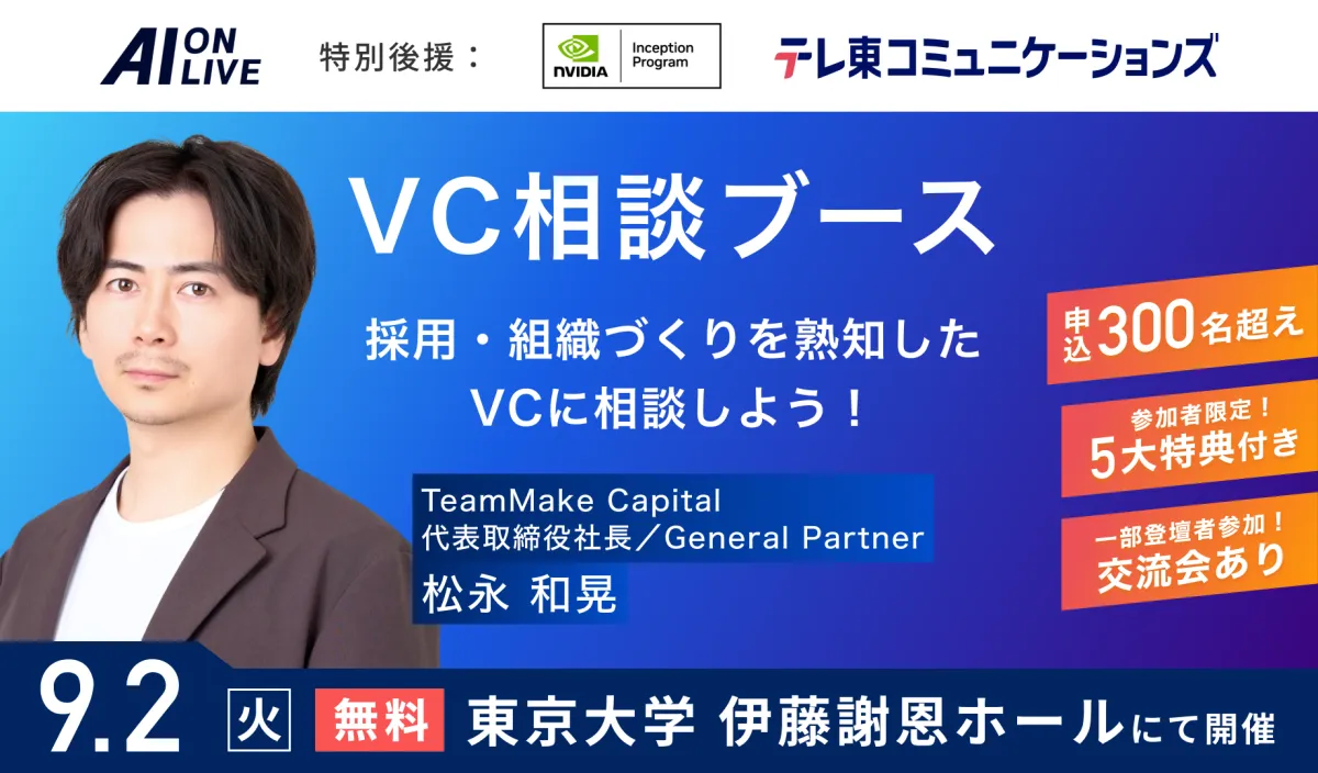 このイベントの目玉は、ベンチャーキャピタル「TeamMake Capital」の創業者、松永和晃氏による「VC相談ブース」の設置です。ここでは、事業構想や組織戦略に関する個別相談を行い、参加者にとって大変有意義な時間となる予定です。チャレンジを続ける経営者や新規事業の立ち上げを考えている方々にとってためになるアドバイスが得られることでしょう。