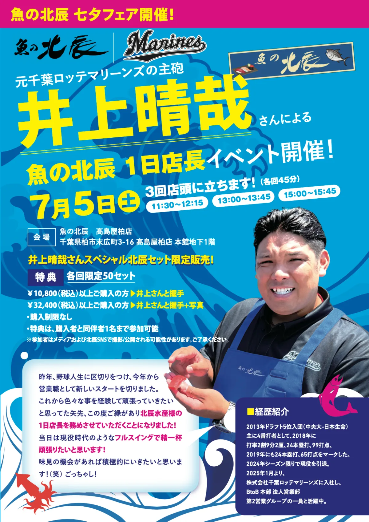 水産エンターテイメントカンパニーの株式会社北辰水産が、元千葉ロッテマリーンズの主砲である井上晴哉さんとのコラボレーションイベント「魚の北辰 1日店長イベント」を開催します。この特別なイベントは、2025年7月5日(土)に千葉県柏市の髙島屋柏店にて行われ、井上さんが実際に店長としての役割を果たします。