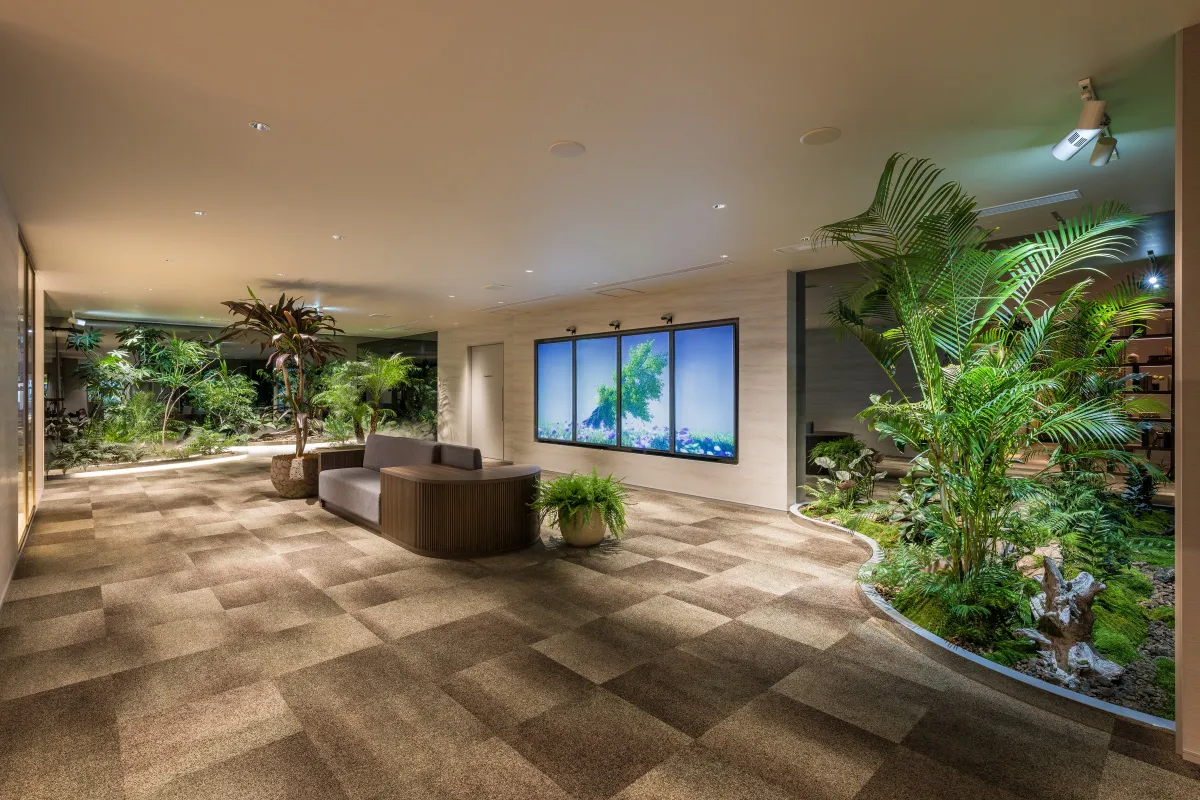 「ジオ ゲストサロン 新宿」は、「植栽とデジタルの融合」というテーマのもと、最新技術と緑豊かな環境を組み合わせた特別な体験空間を提供しています。透明スクリーンを通した幻想感のあるグリーンビュー、インタラクティブなサイネージ、そして実際の植栽が融合したアートスペースが評価されました。さらに、ミストやそよ風といった演出が五感に訴えかけ、生命力あふれる自然の樹木たちは新たなライフスタイルを美しく表現しています。この先進的な取り組みが評価され、屋内緑化の未来を切り拓く成功例として位置づけられています。