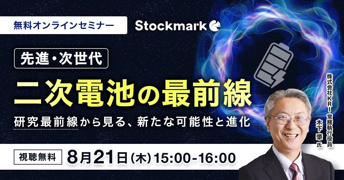 ストックマーク株式会社は、2025年8月21日(木)に無料のオンラインセミナー「先進・次世代二次電池の最前線 ‐ 研究最前線から見る、新たな可能性と進化」を開催します。このセミナーでは、再生可能エネルギーや電動車(EV)の普及に伴う蓄電池技術の最前線についての洞察を得ることができます。