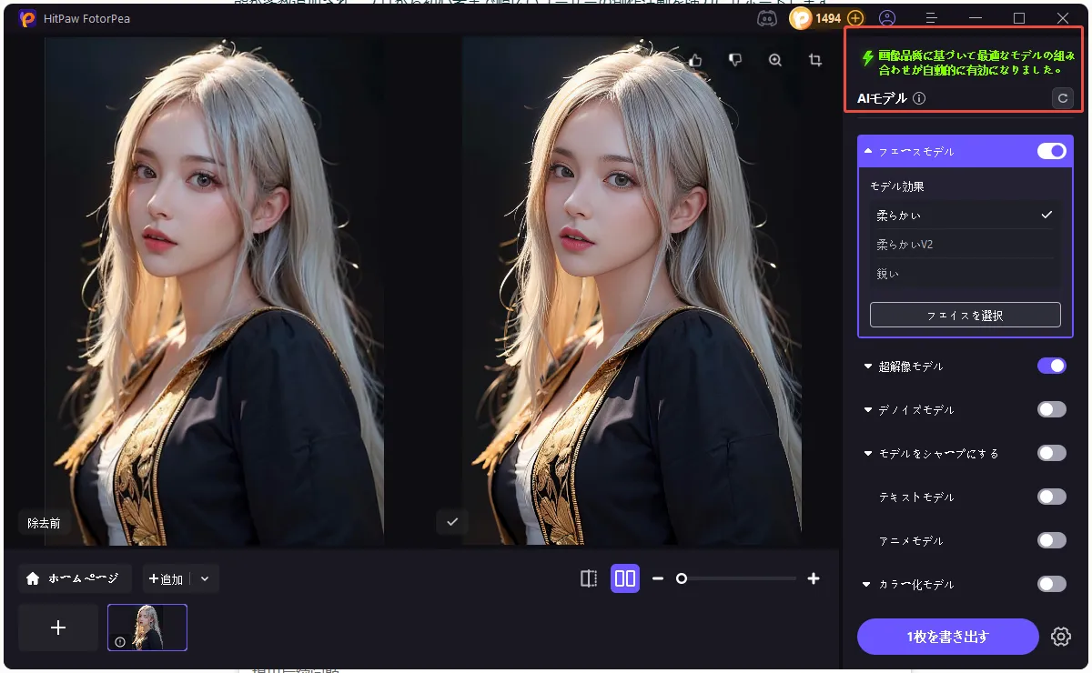 画像の画質をAIが自動で分析し、最も適したモデルを選択して処理を行います。これにより、効率的かつ高品質な編集が実現し、無駄な手間が省けます。