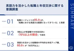 ビズメイツ株式会社が実施した調査によると、英語力が転職や年収交渉において大きなメリットをもたらすことが多くの転職エージェントによって確認されました。この調査は441名の転職エージェントを対象に行われ、驚くべきことに95.4%が英語力が年収交渉に有利に働くと感じています。これにより、英語力を持つ転職者がより好条件での雇用を実現していることが示されています。