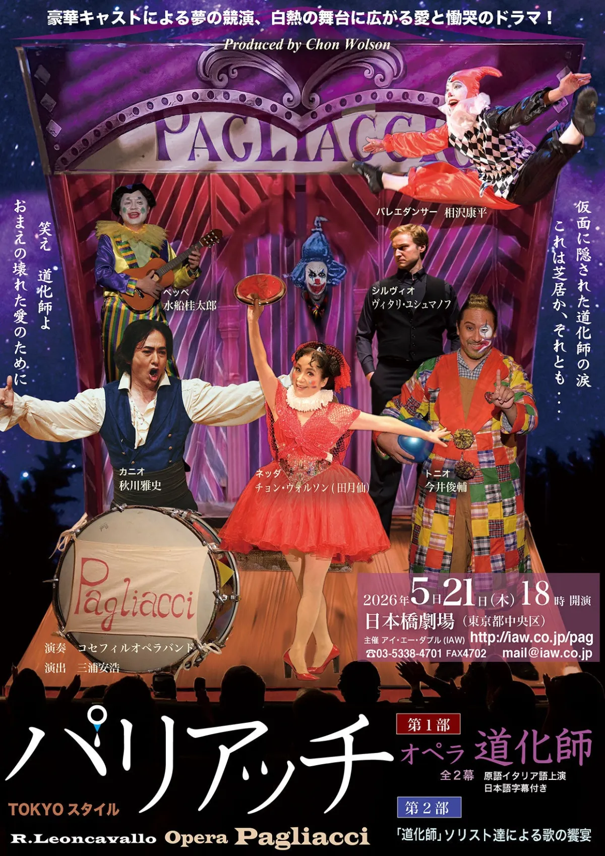 2026年5月21日、東京の日本橋劇場にて、ヴェリズモ・オペラの名作「道化師(パリアッチ)」が上演されます。この作品は、観客を魅了する豪華キャストによる特別な舞台が待っています。主演は「千の風になって」で有名なテノール歌手、秋川雅史が演じる旅回り一座の座長・カニオ。彼の情熱的な歌声で物語が展開され、まるで実際にその場にいるかのような臨場感を味わえます。