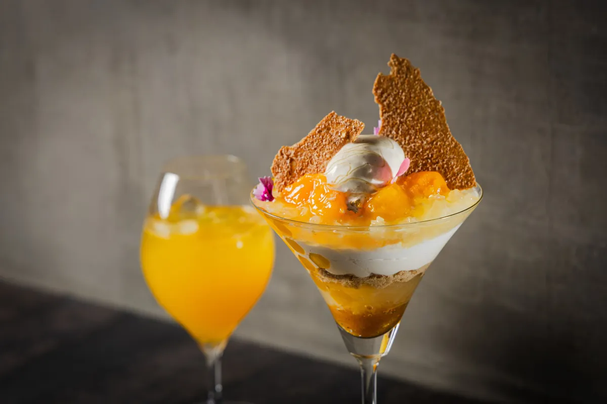 この春限定パフェには、ペアリングカクテルも用意されています。アルコールバージョンの「-ニニギ-」は、天照大神の子孫、ニニギノミコトをイメージしたカクテルです。マンゴーの日向夏に、花の香りを持つリキュールを加え、爽やかにソーダで仕上げています。一方、ノンアルコールカクテルの「春のはちみつ香るマンゴーラッシー」は、ギリシャヨーグルトとマンゴーに、春の花の香りのするはちみつを合わせたもので、しっかりとした味わいと優しい甘さが心地よい余韻を残します。