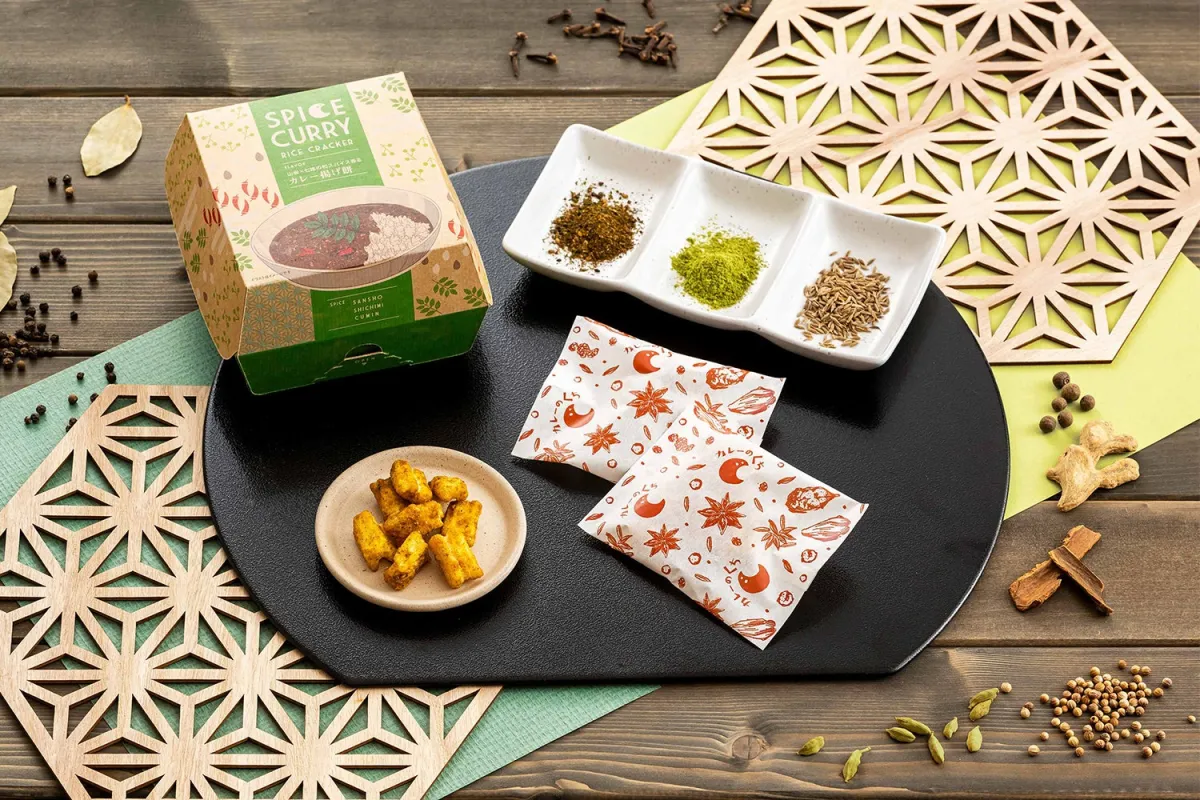 今回の『スパイスカレー揚げ餅』には、大阪のやまつ辻田から選ばれた石臼挽き朝倉粉山椒が使用され、その香り高い特性を際立たせています。また、京都の七味屋本舗製の七味も使用されており、上品な辛さが特長です。カツオ出汁を取り入れたカレーのたれが深いコクを生み、余韻にまで楽しめる和のスパイスの世界を広げています。