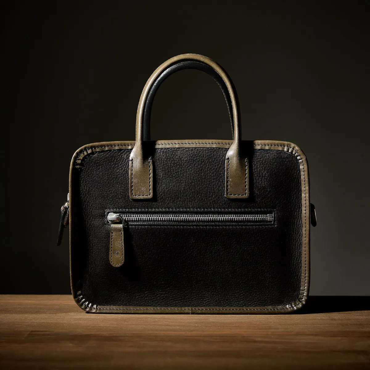 このバッグは、スペイン製のヌバックレザーを使用し、持ち手やフチには希少なオークバークレザーが施されています。洗練されたクラシカルなデザインは、特別な熟練工が丁寧に仕立てた結果、独特なフォルムが実現されています。
