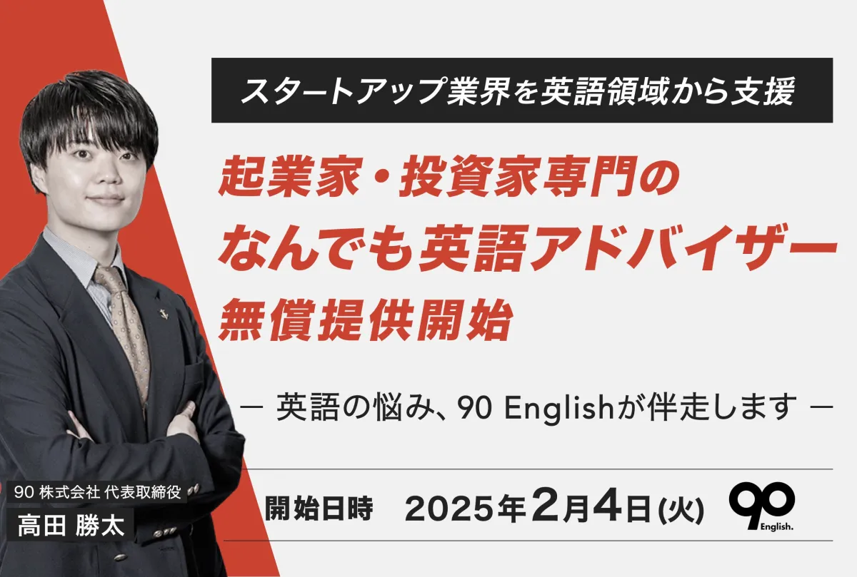 90株式会社は、これまで多くの起業家や投資家に対して英語学習を支援するプログラム「90 English」を提供してきました。ここでは、過去に受講した著名な起業家たちも多く含まれており、彼らの英語の悩みを直接解決するための知見が蓄積されています。特に、海外の起業家や投資家とのコミュニケーションでは、自らの言葉で伝える力が求められることを実感したため、これを受けて『なんでも英語アドバイザー』を設置する運びとなりました。