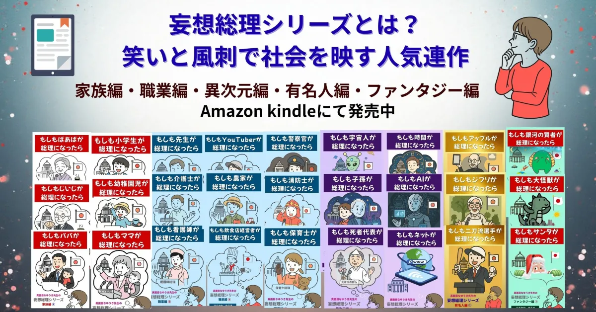 日常の出来事や社会問題をユーモアを交えて描く『妄想総理シリーズ』。このシリーズは、日々の生活に潜む些細な出来事を異なる視点から捉え、笑いあり、風刺ありで読者に新たな気づきを提供します。シリーズは、家庭や職場など、あらゆる社会構造を反映させており、どんな人でも共感できるテーマになっています。