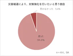 2024年は、多くの自然災害が発生し、全国的に防災対策への関心が高まっています。調査結果によると、参加者の94.6%が「災害報道を見聞きして、準備・対策を行いたい」と回答しています。また、大規模な災害を想定した準備が「十分できている」と認識している人は、昨年に比べて12.5ポイントの増加を記録しました。