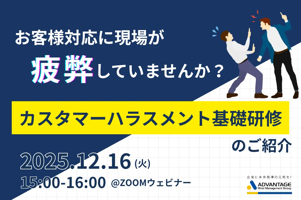 株式会社アドバンテッジリスクマネジメントは、2025年12月16日(火)に、無料のWebセミナー「お客様対応に現場が疲弊していませんか?カスタマーハラスメント基礎研修のご紹介」を実施します。このセミナーは、人事・労務部門やメンタルヘルス担当者、管理職の方々を対象にしています。