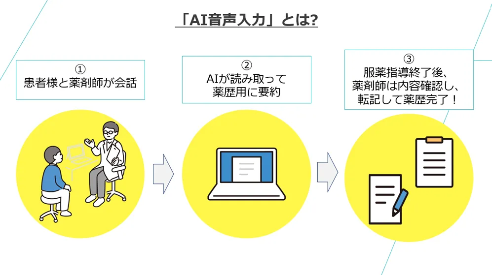 新たに導入される『CARADA 電子薬歴』は、患者の症状や処方内容、指導履歴などを一元管理できます。さらに、薬剤師が行う服薬指導の際には、「AI音声入力」を使うことで、会話を録音し生成AIが自動要約してテキスト化します。これにより、従来必要であったメモ取りや後処理の手間が省け、薬歴作成がスムーズに行えるようになります。